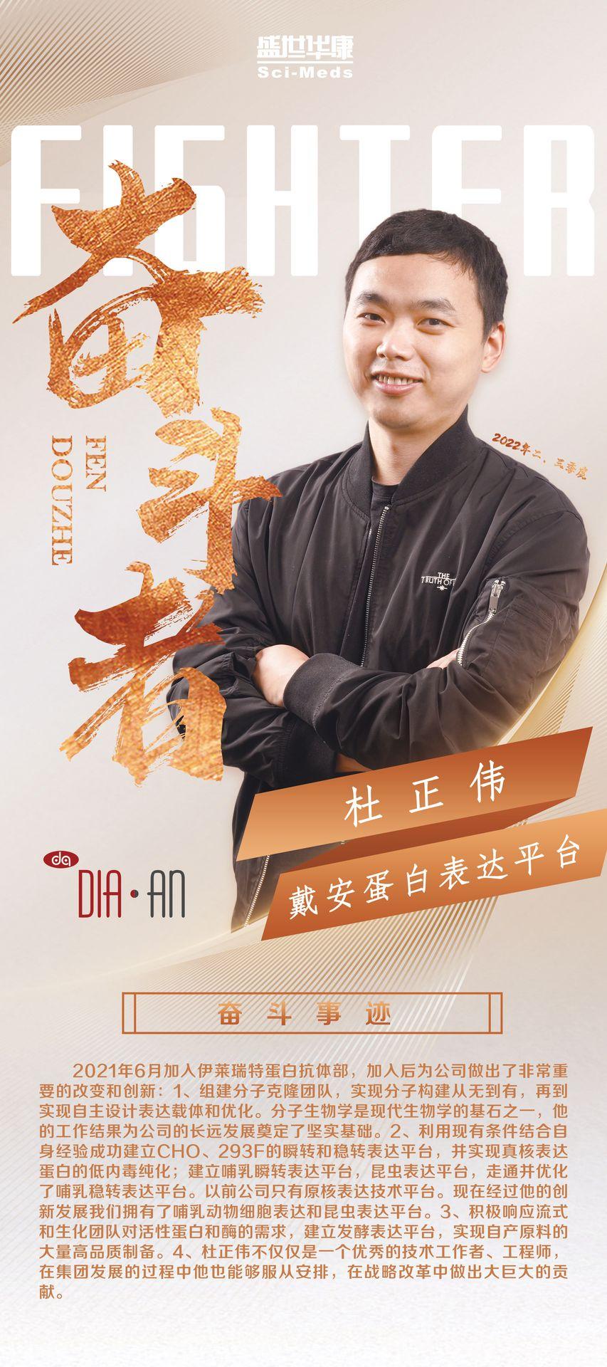 我提名杜正伟作为奋斗者候选人,希望大家投他一票。他勤奋好学,乐于助人,谦逊隐忍,牺牲小我成就大家的优秀品质值得每一个人学习。最后,我也祝愿戴安生物能够越做越好,为每个人提供更大更好的舞台,早日实现大家的梦想。
